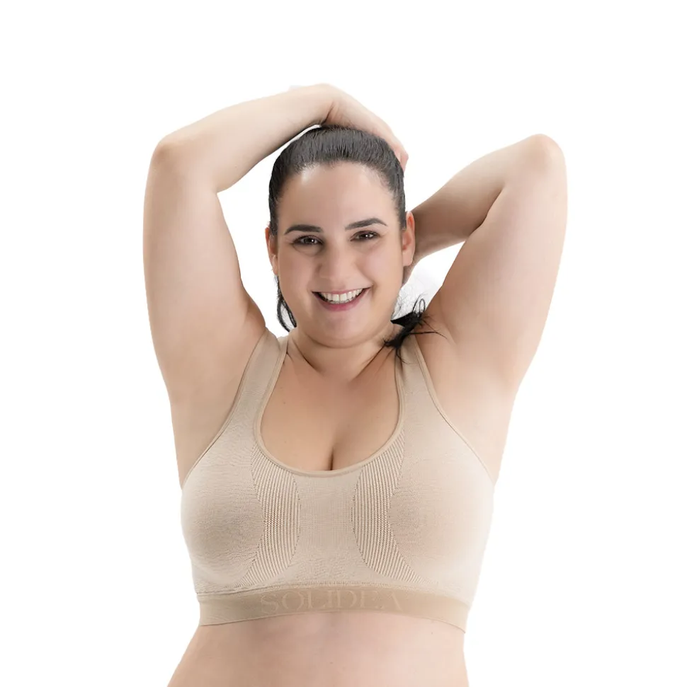Reggiseno a compressione in tessuto micromassaggiante per un confortevole sostegno. Il dispositivo è indicato per la gestione e l’alleviamento del ritorno linfatico e per prevenire uno o più disturbi della circolazione linfatica (p. Es., linfedema). La trama micromassaggiante favorisce il drenaggio dei tessuti della regione toracica e di quella sottoascellare, per una pelle più liscia e più tonica. Si indossa con facilità e grazie alla sua conformazione alta ed avvolgente abbraccia gradevolmente il busto, con benefici anche sulla postura. E’ inoltre senza ganci e privo di cuciture nelle zone rinforzate per donare il massimo confort anche alle donne sottoposte a mastoplastica additiva e riduttiva.