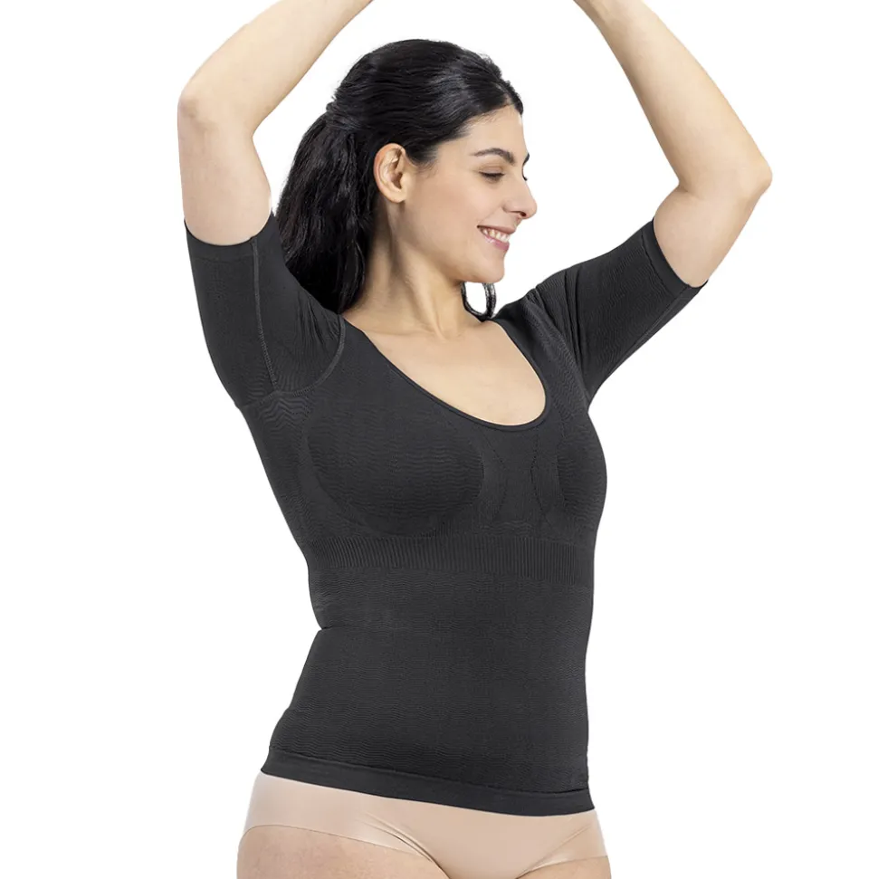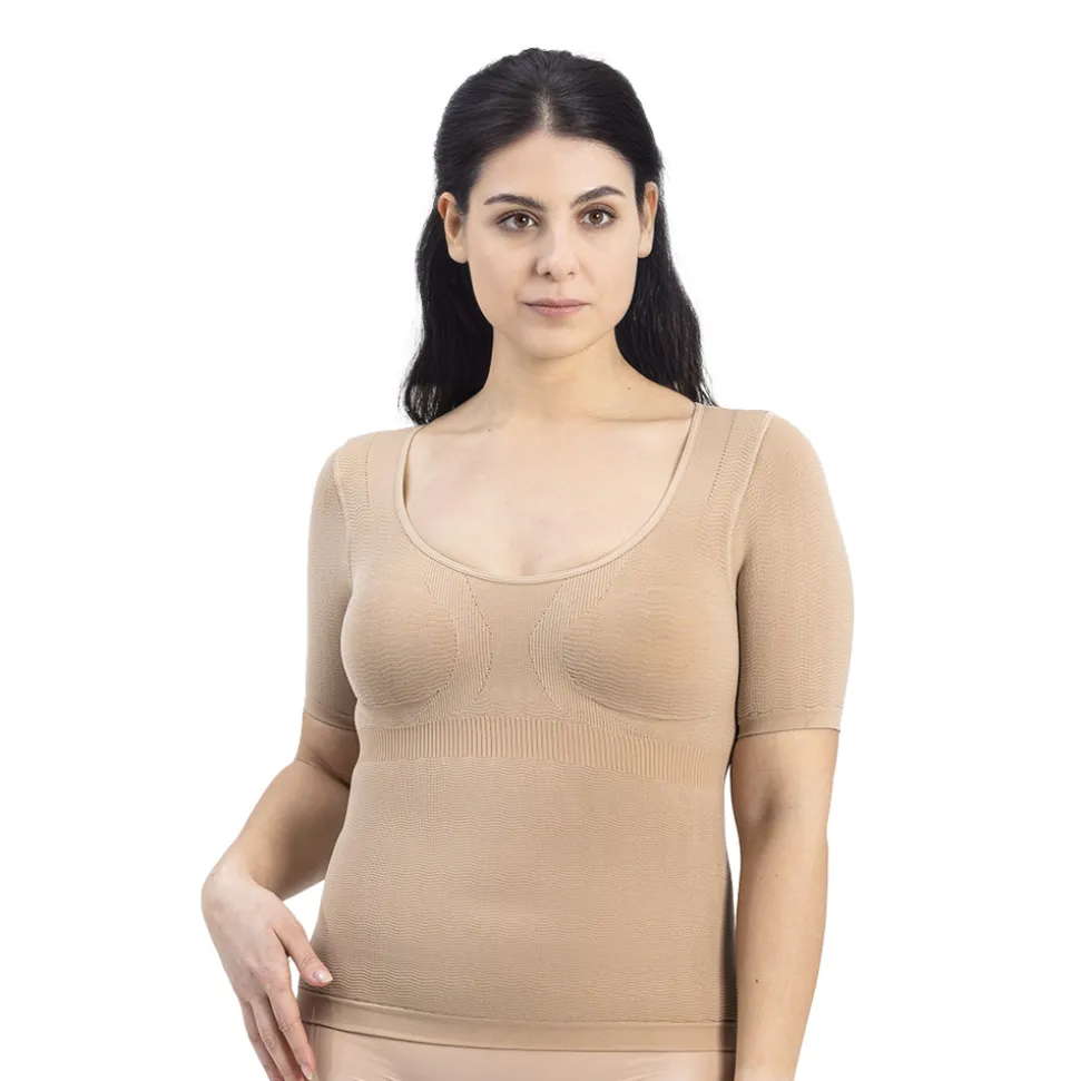 T-shirt a compressione in tessuto micromassaggiante con reggiseno incorporato per un confortevole sostegno e con manica fino al gomito. Il dispositivo è indicato per la gestione e l’alleviamento del ritorno linfatico e per prevenire uno o più disturbi della circolazione linfatica (p. Es., linfedema). La trama micromassaggiante favorisce il drenaggio dei tessuti della regione toracica, sottoascellare, addominale, dorsale e delle braccia per una pelle più liscia e più tonica. Si indossa con facilità e grazie alla sua conformazione avvolgente che abbraccia gradevolmente il seno e il busto, con benefici anche sulla postura. E’ privo di cuciture nelle zone rinforzate del reggiseno per donare il massimo confort anche in caso di mastoplastica additiva e riduttiva.