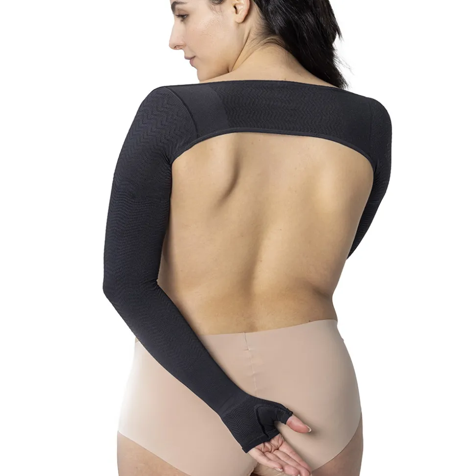 Maniche micromassaggianti dotate di palmare, con compressione graduata 15/21 mmHg. Il dispositivo è indicato per la gestione e l’alleviamento del ritorno venoso e linfatico, per prevenire uno o più disturbi della circolazione (p. Es., Edema, trombosi venosa profonda (TVP), varicosi, linfedema) e in caso di lipedema. Il dispositivo è indicato come ausilio al trattamento dell’aspetto della buccia d’arancia (cellulite).Il tessuto micromassaggiante con i naturali movimenti degli arti superiori stimola la microcircolazione. Il micromassaggio attivo del tessuto tridimensionale lascia dei leggeri solchi sulla pelle che spariscono entro qualche ora, lasciando la pelle liscia.L’innovativo supporto dorsale sostiene le maniche avvolgendo le spalle per una perfetta vestibilità.Il filato batteriostatico, dalle speciali proprietà traspiranti garantisce il mantenimento dell’equilibrio biologico della pelle, contrastando l’insorgenza di cattivi odori. Particolarmente indicato per illinfedema agli arti superiori.
