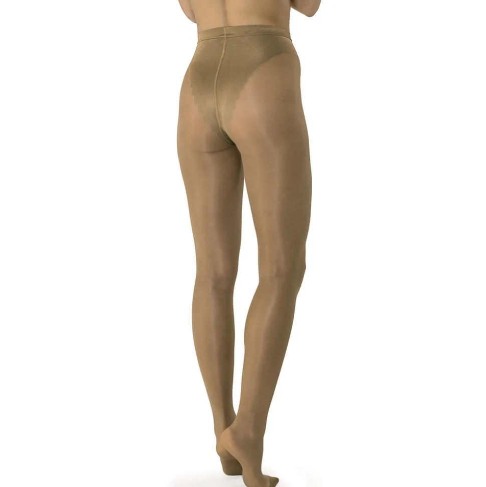 Collant 100 den a maglia liscia, straordinariamente velato, con compressione graduata 15/18 mmHg. Il dispositivo e’ indicato per la gestione e l’alleviamento del ritorno venoso e linfatico, per prevenire uno o più disturbi della circolazione (p. Es., Edema, trombosi venosa profonda (TVP), varicosi, linfedema).Il raffinato corpino sgambato modella lafigura e contiene il ventre. Una carezza difluida seta sulle vostre gambe e una delicata inaspettata morbidezza sotto i vostri piedi, per una soffice base d’appoggio. Tassello igienico in cotone e cucitura piatta. Con trattamento antimicrobico.