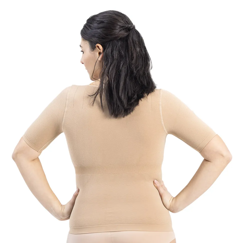 T-shirt a compressione in tessuto micromassaggiante con reggiseno incorporato per un confortevole sostegno e con manica fino al gomito. Il dispositivo è indicato per la gestione e l’alleviamento del ritorno linfatico e per prevenire uno o più disturbi della circolazione linfatica (p. Es., linfedema). La trama micromassaggiante favorisce il drenaggio dei tessuti della regione toracica, sottoascellare, addominale, dorsale e delle braccia per una pelle più liscia e più tonica. Si indossa con facilità e grazie alla sua conformazione avvolgente che abbraccia gradevolmente il seno e il busto, con benefici anche sulla postura. E’ privo di cuciture nelle zone rinforzate del reggiseno per donare il massimo confort anche in caso di mastoplastica additiva e riduttiva.