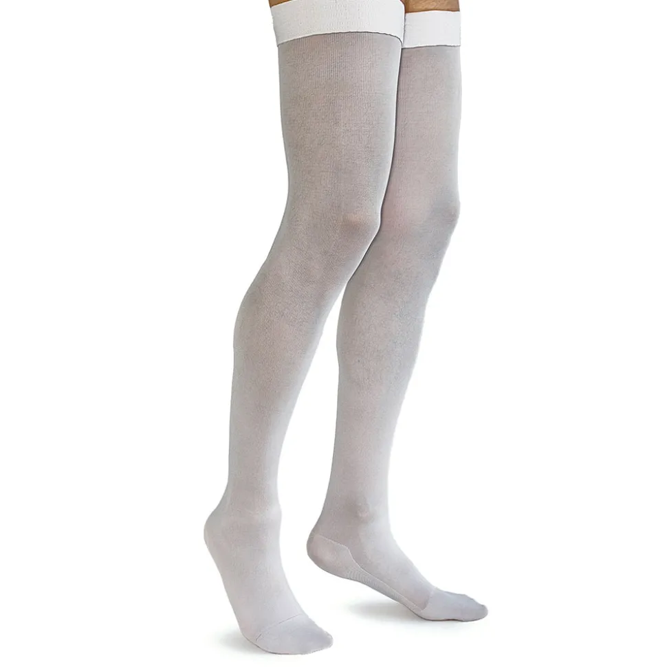 Calze elastiche fino all’inguine (AG) con balza siliconata autoreggenti a compressione 15/18 mmHg per la prevenzione della trombosi venosa profonda (TVP) e dell’embolia polmonare (EP) per soggetti con indice di massa corporea (IMC) superiore o uguale a 30. La balza siliconata rinforzata è anti-arrotolamento, permettendo un’ottima vestibilità anche su arti particolarmente voluminosi e con tessuti rilassati. Indicate in caso di interventi chirurgici, in caso di parto, di lungo allettamento, neurologici, politraumatizzati. L’elastocompressione riduce il volume venoso e determina a parità di portata venosa un aumento della velocità del flusso riducendo la stasi, fattore essenziale della trombosi venosa profonda (TVP). Lo speciale tessuto a maglia tridimensionale le rende morbide e confortevoli, facili da indossare. Sono realizzate in filato batteriostatico che grazie alla presenza degli ioni d’argento ostacola la proliferazione batterica garantendo il mantenimento dell’equilibrio biologico della pelle. Queste calze mantengono le loro caratteristiche se sottoposte a lavaggi fino a 80°.