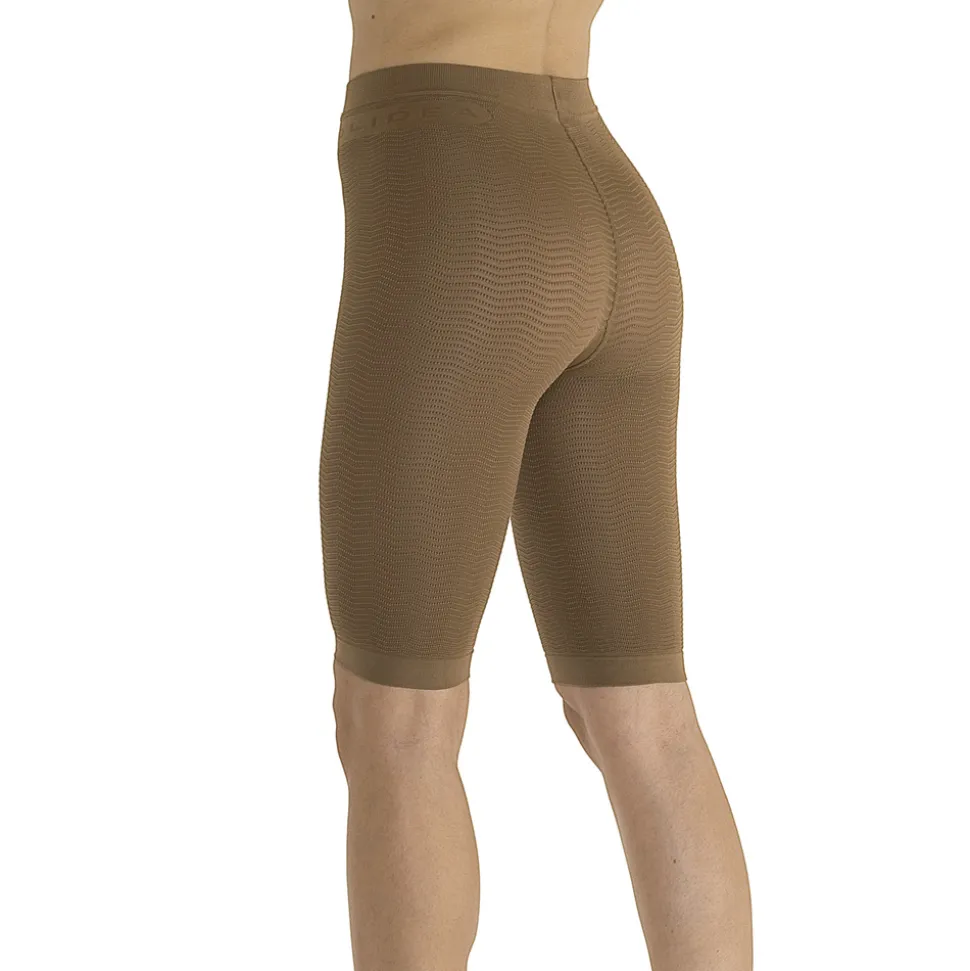 Pantaloncino a compressione modello bermuda. La speciale tessitura ad onde tridimensionali esercita un benefico micromassaggio che favorisce la microcircolazione e l’eliminazione dei liquidi in eccesso, riducendo la massa corporea, ed attiva un effetto ventilato e traspirante che ostacola l’insorgenza di cattivi odori. Inoltre, il filato contiene un additivo minerale che converte l’energia termica del corpo umano in FIR (Far Infrared Rays) e rimanda al tessuto cutaneo un gradevole effetto termoregolatore. L’effetto sinergico di queste caratteristiche favorisce l’ossigenazione delle cellule, aumenta il metabolismo fra sangue e tessuto cutaneo ed agisce efficacemente contro la formazione della cellulite. Cosce, glutei ed addome migliorano in tonicità ed aspetto. Con trattamento antimicrobico.