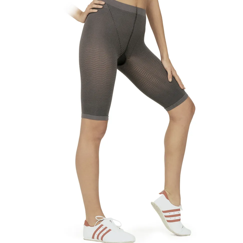 Pantaloncini modello bermuda, morbidi ed eleganti dal tessuto ad onde tridimensionali che, con i naturali movimenti del corpo, agiscono sulla cute con un profondo e delicato micromassaggio. Il dispositivo è indicato come ausilio al trattamento dell’aspetto della buccia d’arancia (cellulite). Realizzati con un filato speciale che, grazie all’azione batteriostatica degli ioni d’argento, mantiene l’equilibrio biologico della flora batterica e permette la naturale traspirazione della pelle, ostacolando l’insorgenza di cattivi odori. Il micromassaggio attivo del tessuto lascia dei leggeri solchi sulla pelle, segno della sua efficacia drenante, che spariscono entro qualche ora, lasciando la pelle liscia e svuotata dai liquidi in eccesso.Tassello igienico in cotone e cucitura piatta.